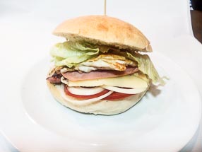 Hamburguesa Especial Gorgona: 2 Carnes, lechuga, tomate, cebolla, jamón york, queso, beicon y huevo