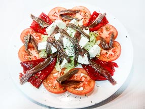 Ensalada Capricho: Tomate, pimientos del piquillo, anchoas y taquitos de queso 9€ |
